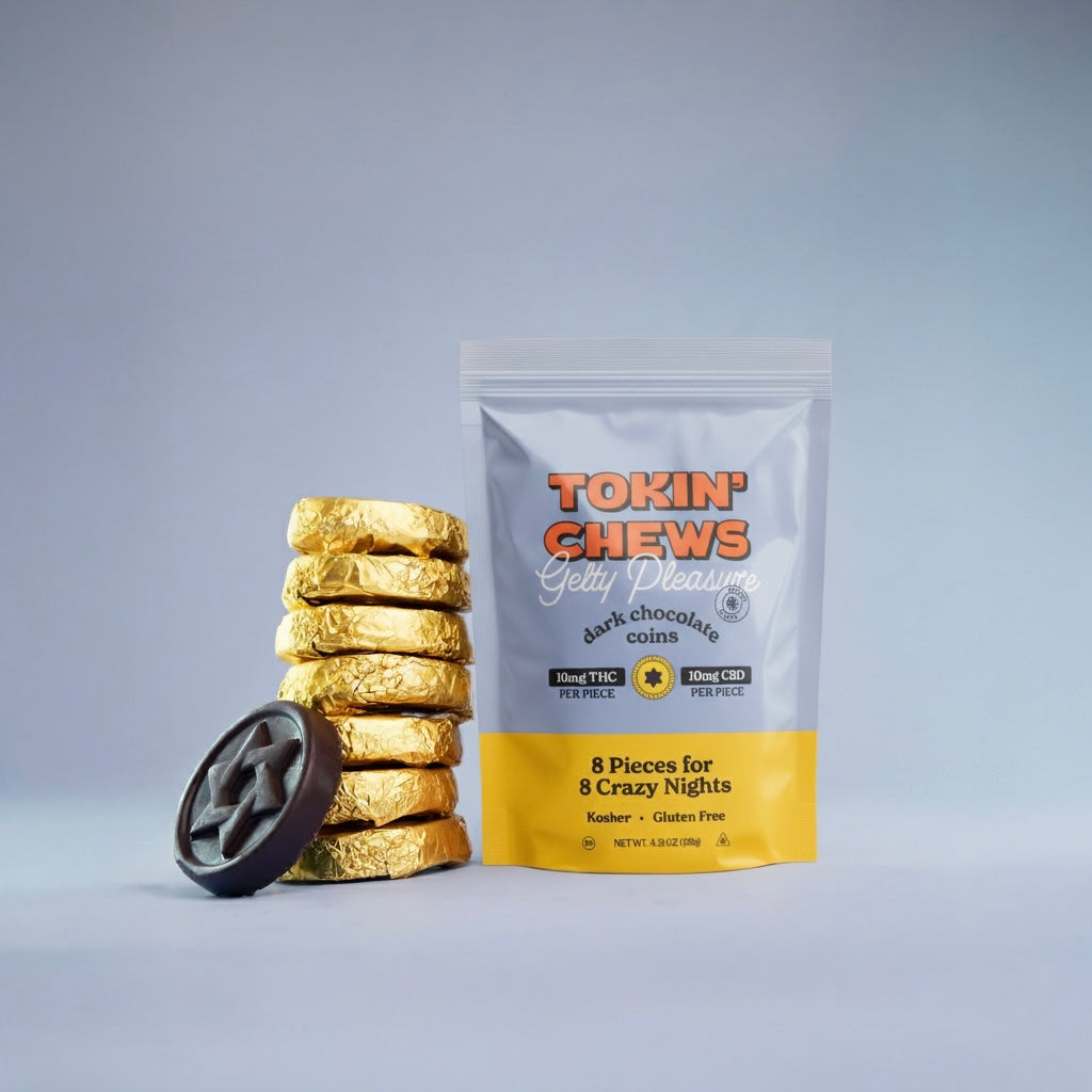 Gelty Pleasure is our reimagined take on classic Hanukkah gelt. Each pack includes eight infused chocolate coins for eight hazy nights, individually wrapped in gold foil and tucked inside a collectible, child-safe box and nostalgic satchel.