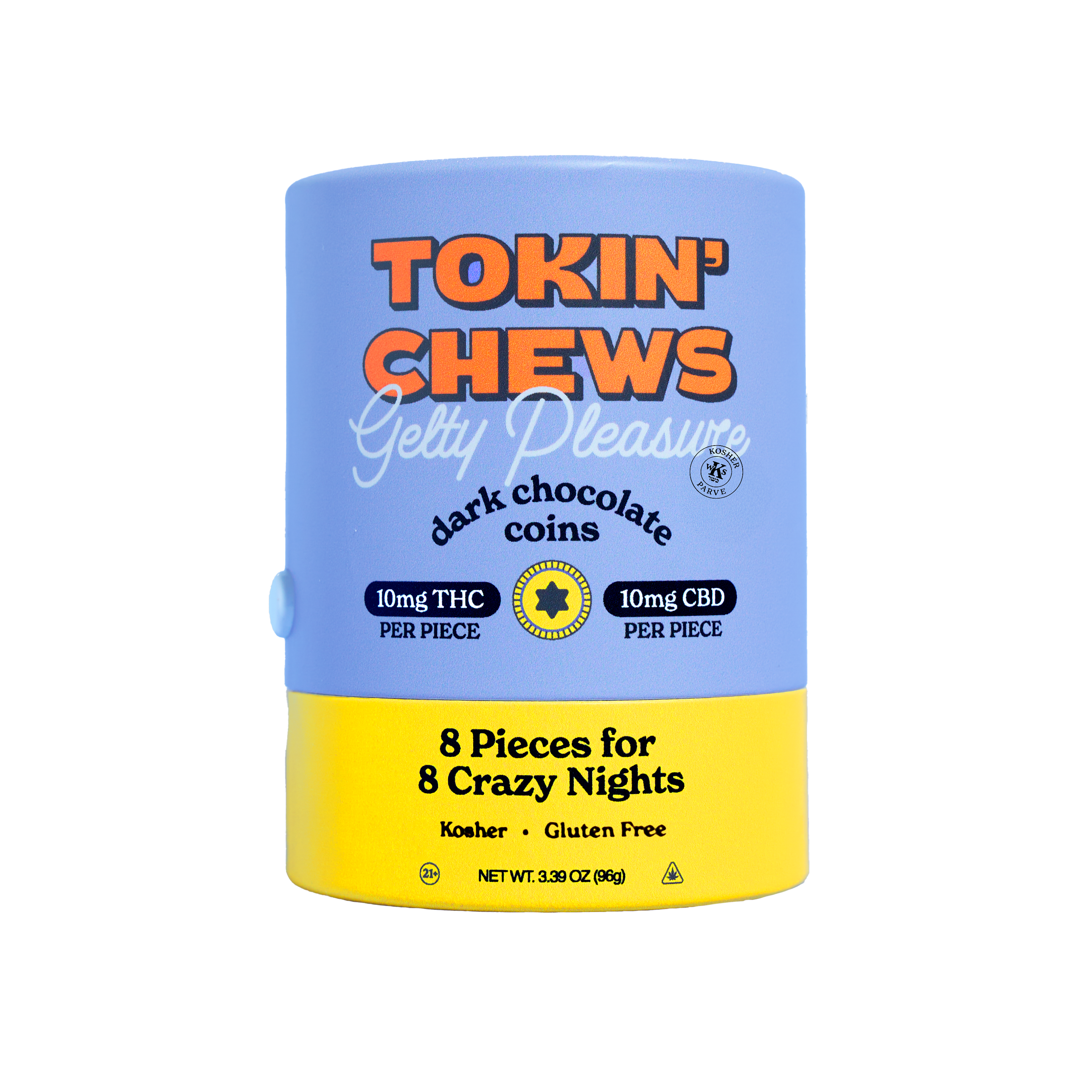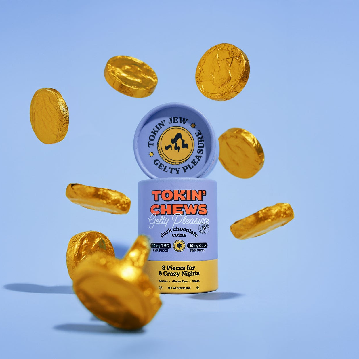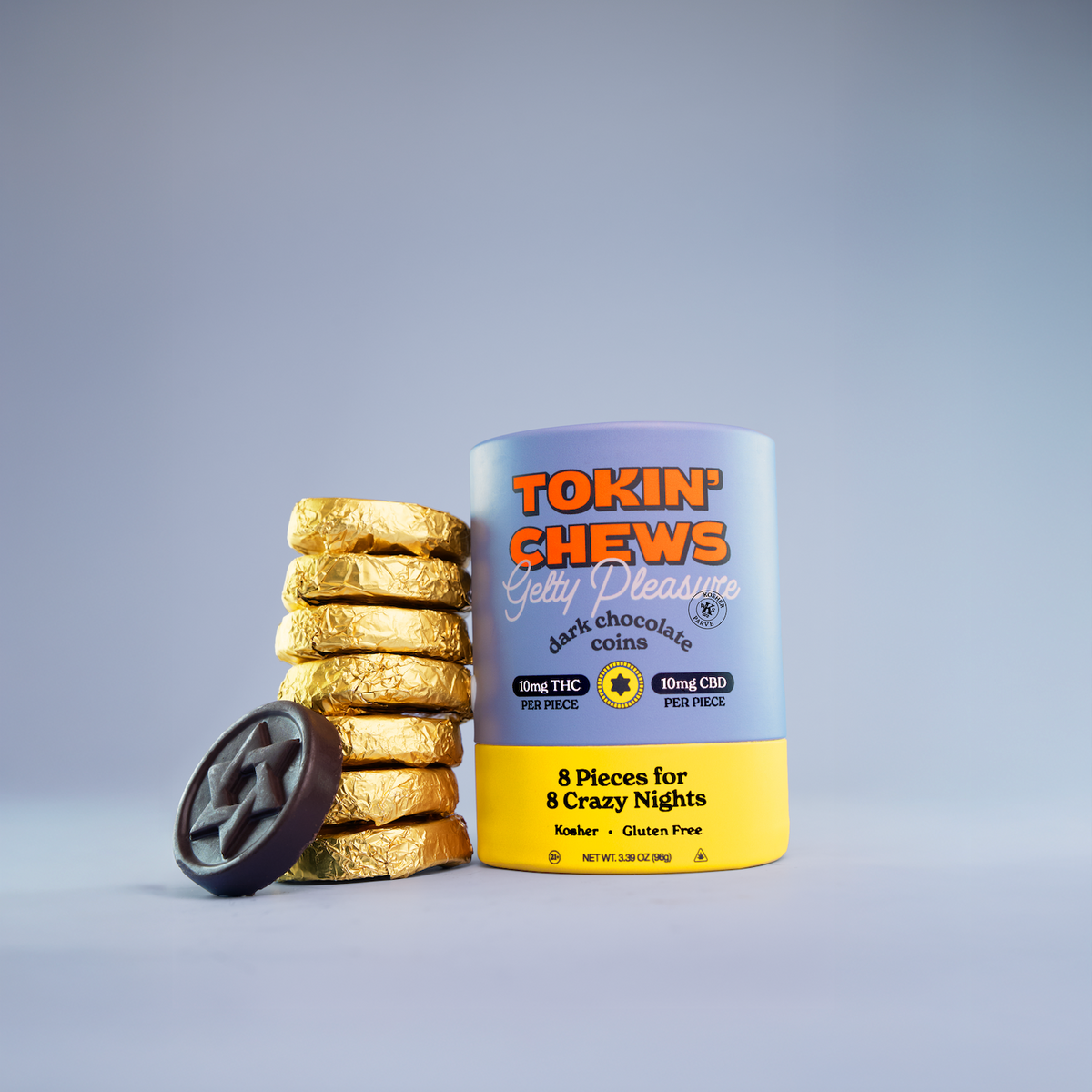 Gelty Pleasure is our reimagined take on classic Hanukkah gelt. Each pack includes eight infused chocolate coins for eight hazy nights, individually wrapped in gold foil and tucked inside a collectible, child-safe box and nostalgic satchel.